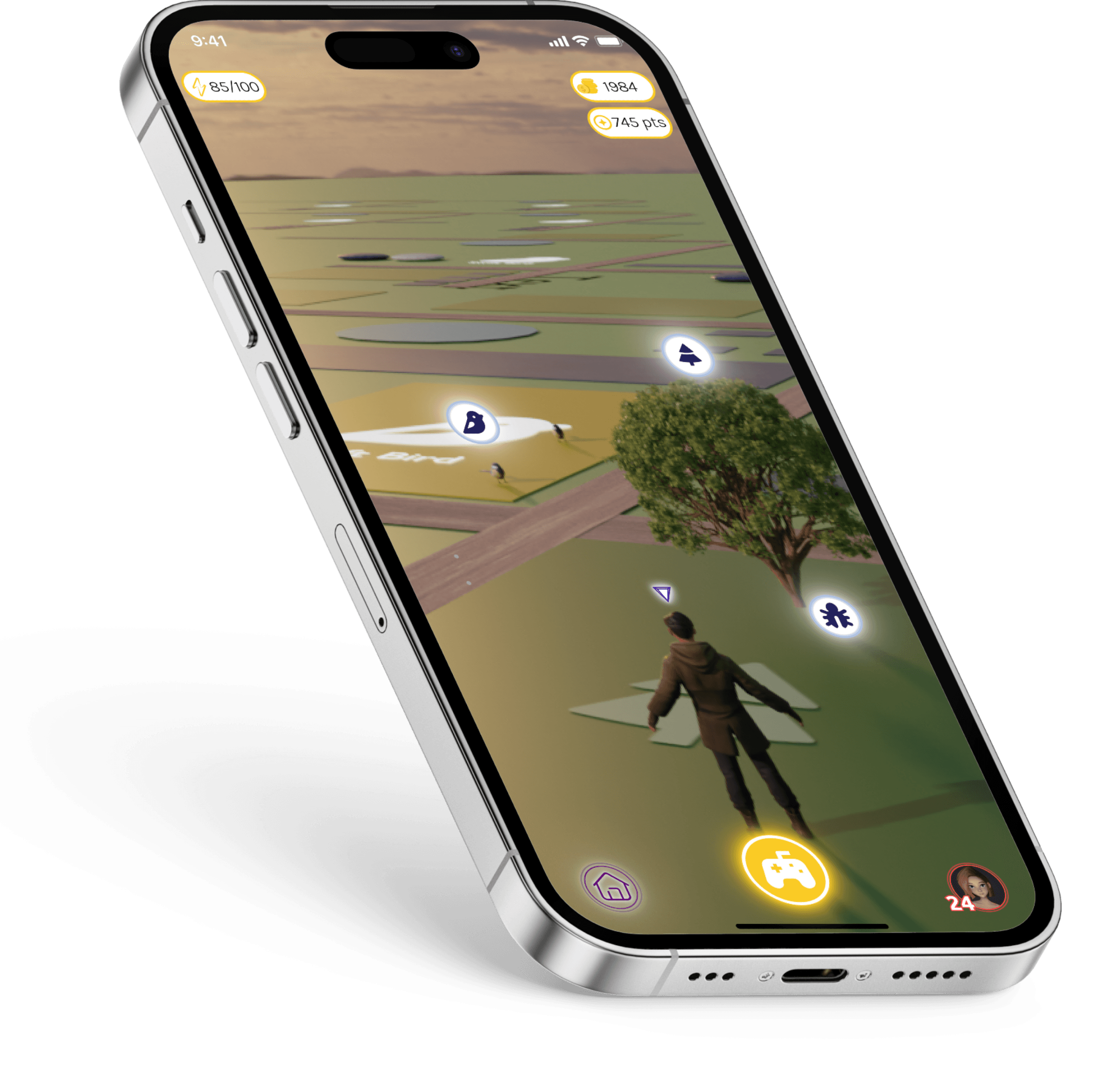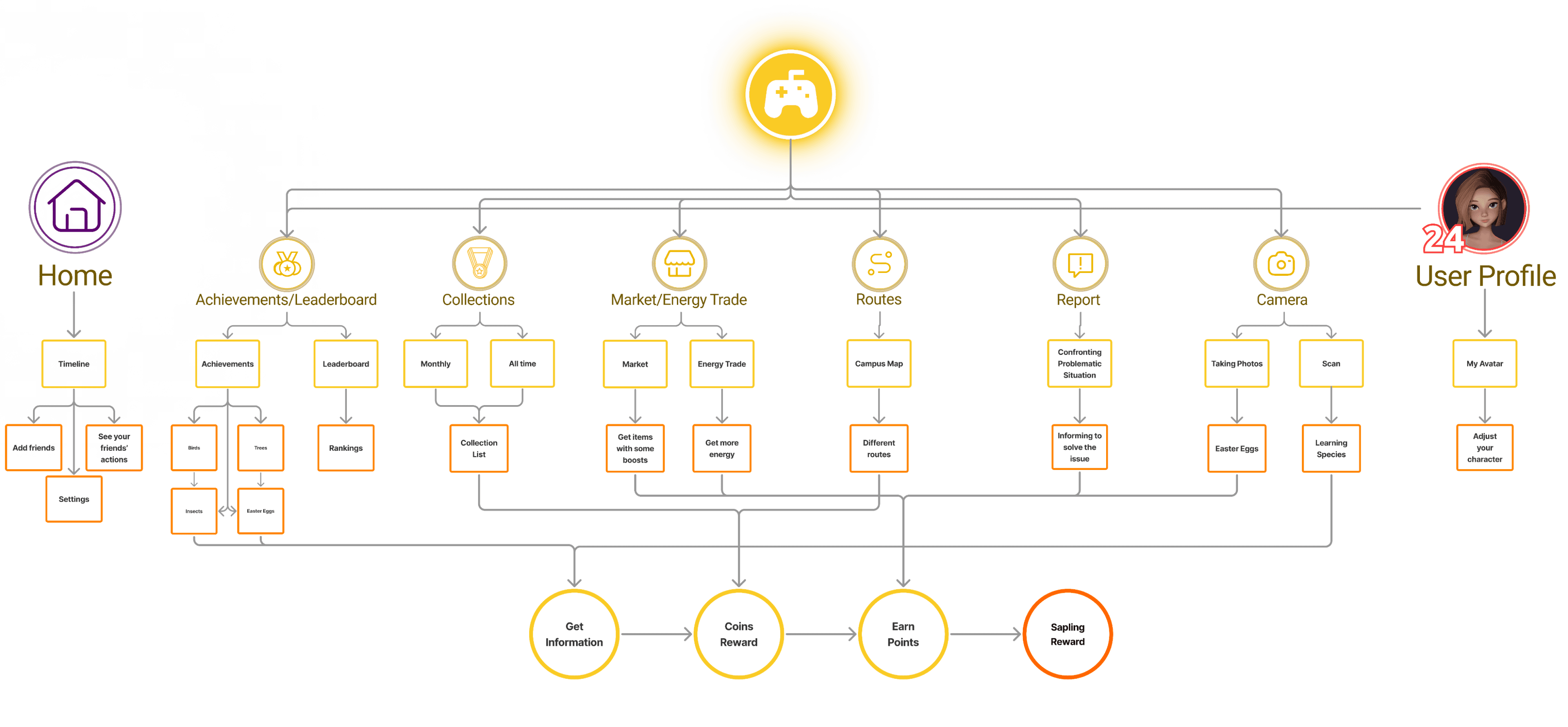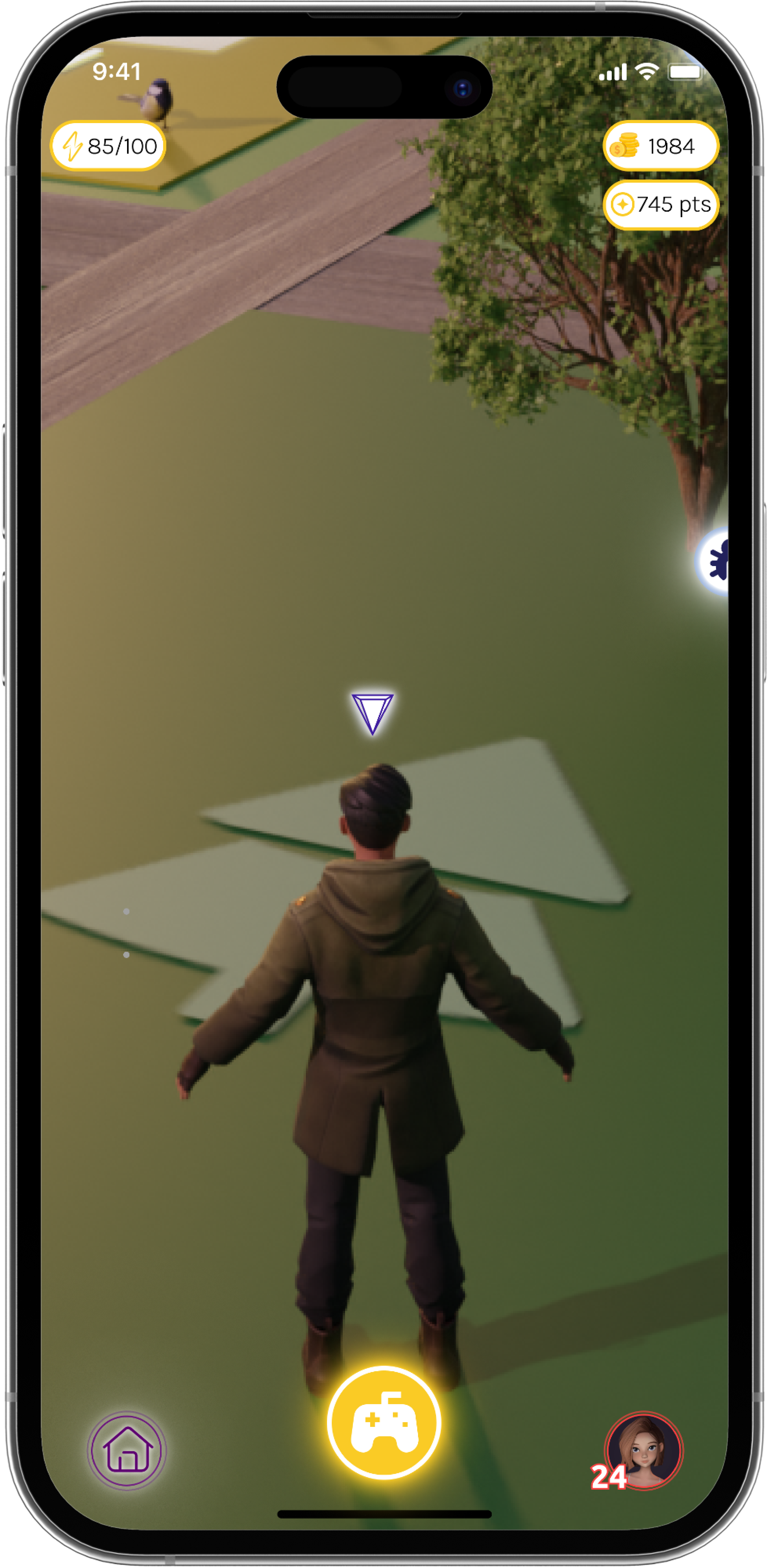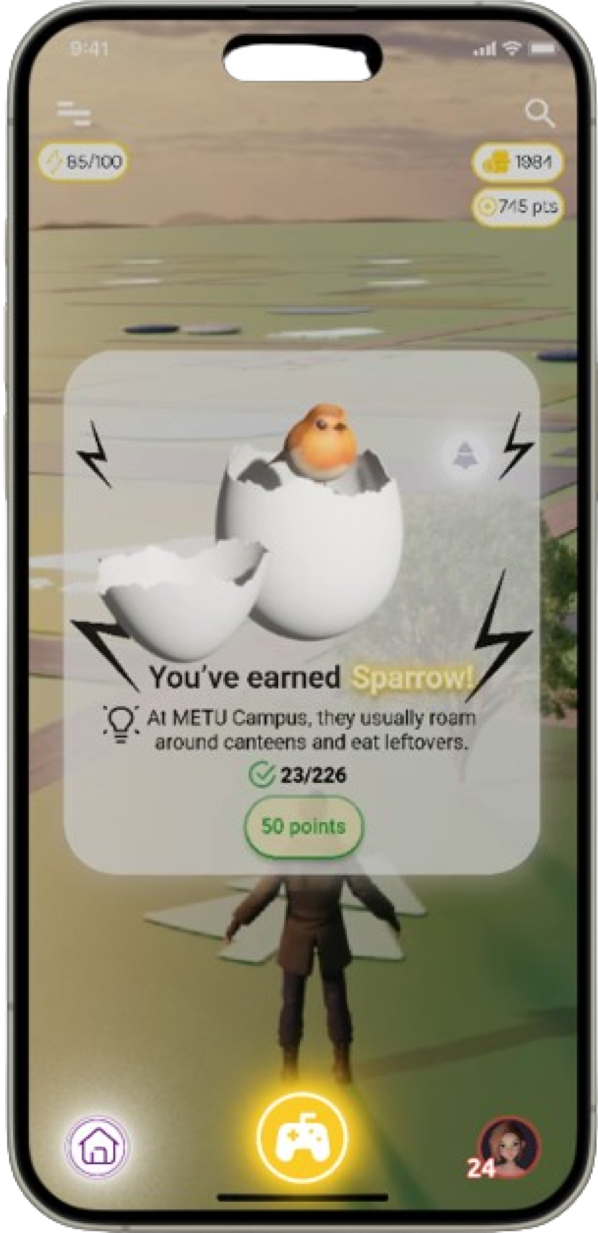 The center of the screen features an avatar representing the user, showing the user’s current location on the map, surrounded by various iconic symbols that can be discovered throughout the campus. The top of the home screen displays information about the user, such as their energy level, points collected, and in-game currency. These elements make it easy for the user to track their in-game progress.