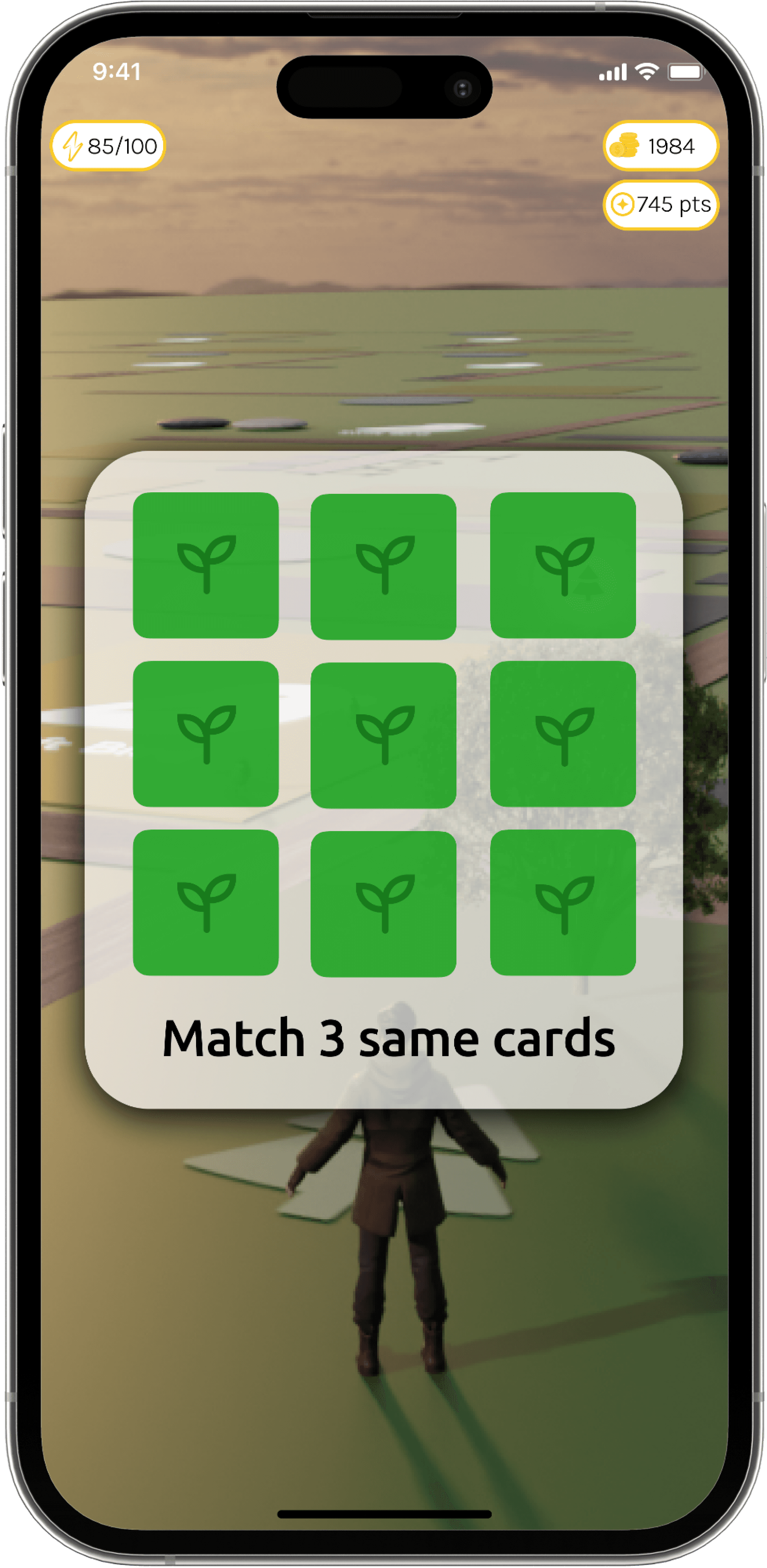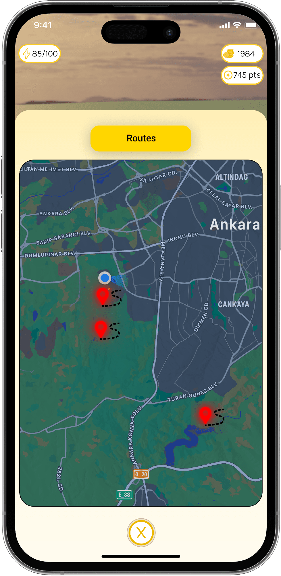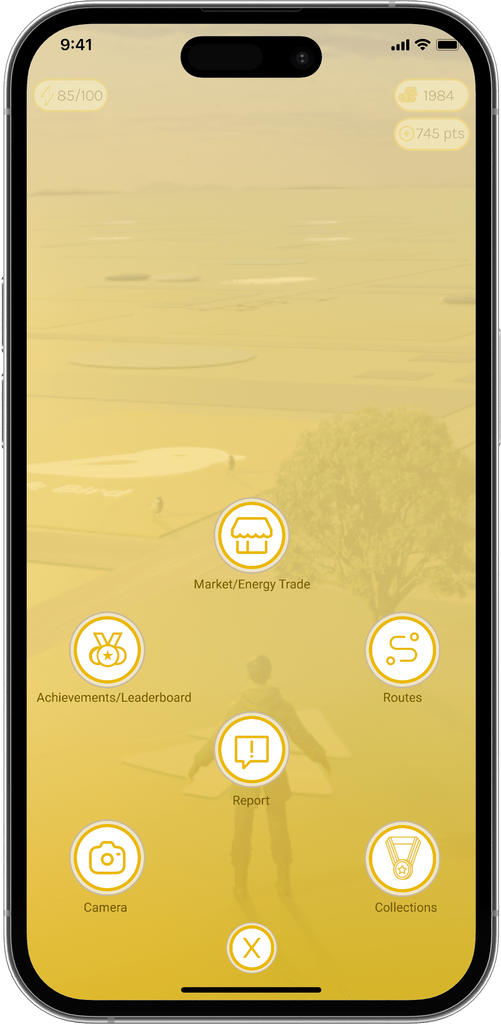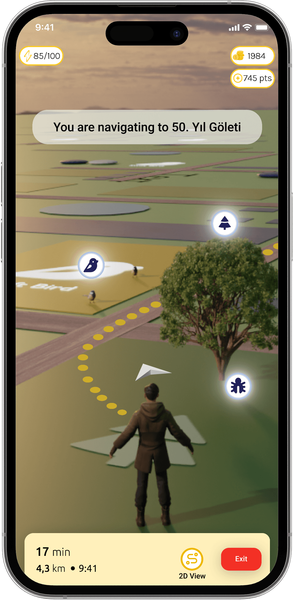 The center of the screen features an avatar representing the user, showing the user’s current location on the map, surrounded by various iconic symbols that can be discovered throughout the campus. The top of the home screen displays information about the user, such as their energy level, points collected, and in-game currency. These elements make it easy for the user to track their in-game progress.