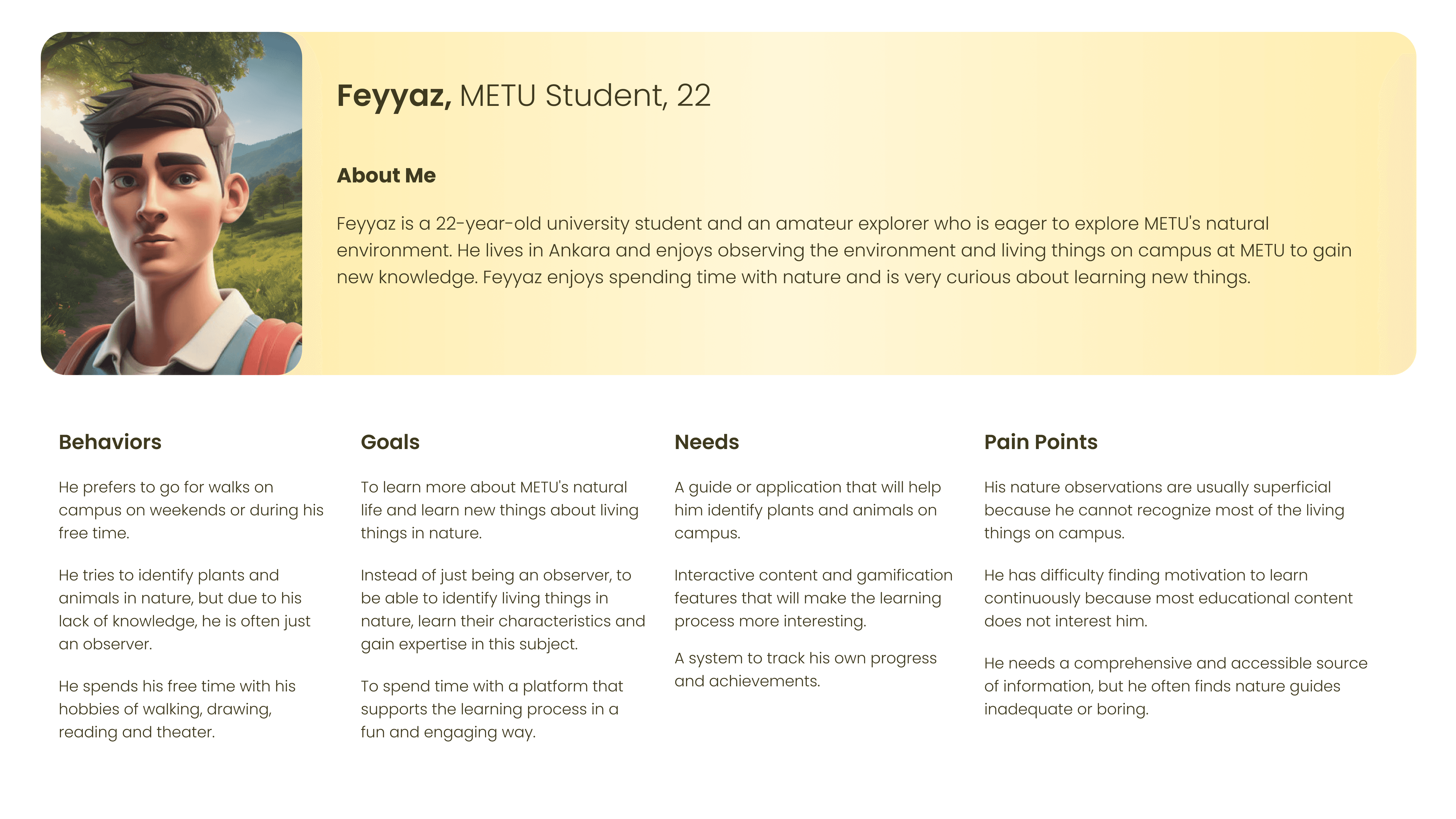 It was aimed to convey METU nature to users in a better way by making a game design. The main purpose of the game is to teach users about the determined creatures on campus by visiting METU nature. As users approach the probable locations of the creatures, icons can appear on the screen according to the creature type. If users can successfully complete random mini-games, they will be able to get that creature as an achievement.